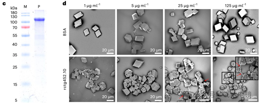 d. 在體外對 ctg452.10 蛋白的功能驗證。掃描電鏡圖像顯示了在不同濃度的牛血清白蛋白(BSA)和重組 ctg452.10 蛋白(rctg452.10)條件下碳酸鈣晶體的沉澱情況。紅色箭頭表示 ctg452.10 蛋白形成絲狀纖維。