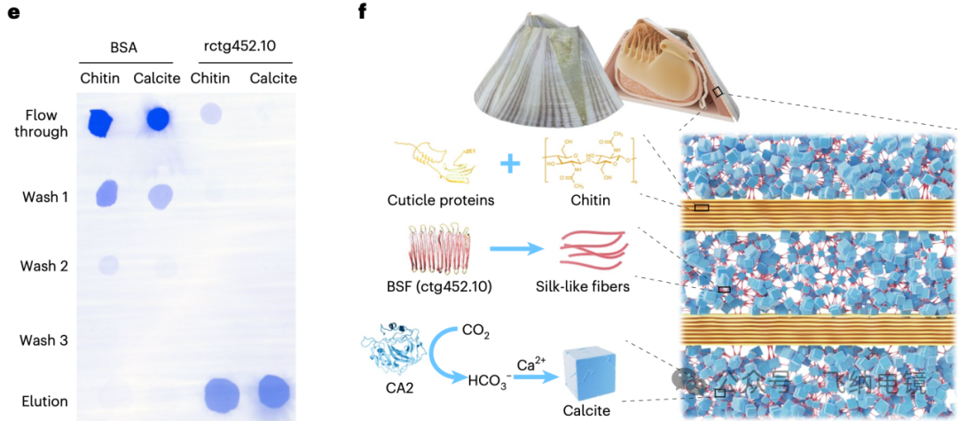 e. rctg452.10 蛋白與幾丁質和方解石的結合實驗結果,以牛血清白蛋白(BSA)作為對照,通過考馬斯染色進行可視化。